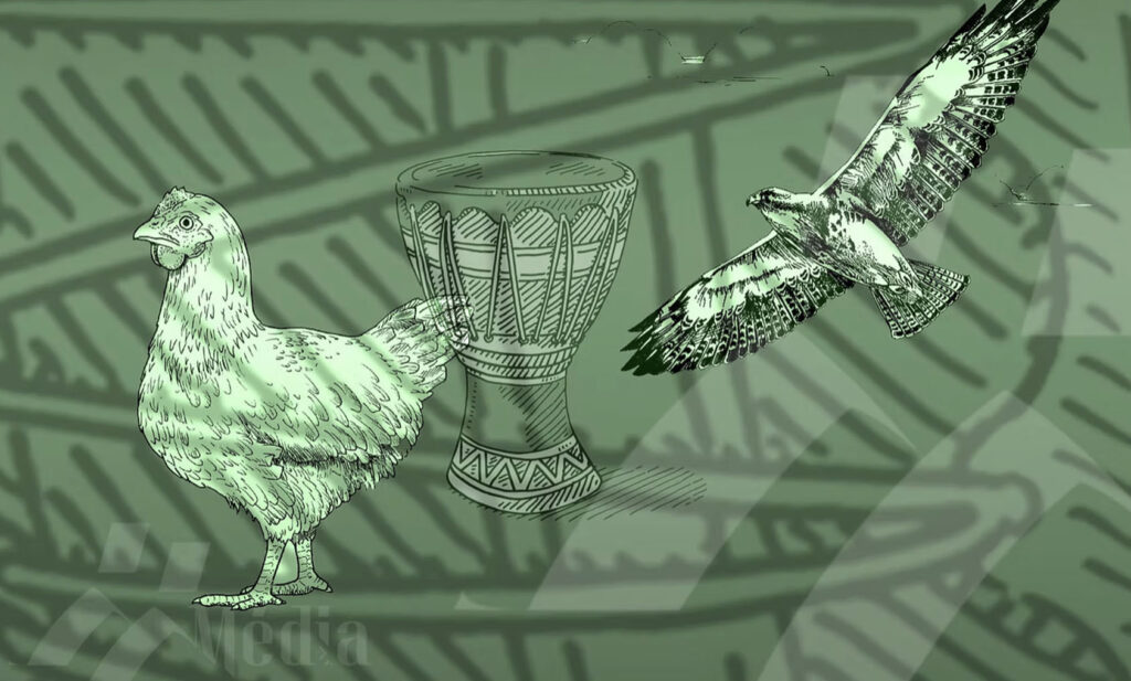 Quelque chose dans le ton de Poule a éveillé les soupçons d’Épervier. Il fait semblant de repartir vers son champ mais revient en cachette par un petit sentier jusqu’à la concession. Il se cache derrière sa case et attend… Quand elle le croit loin. Poule arrive tranquillement, se perche sur le tam-tam et se met à taper.